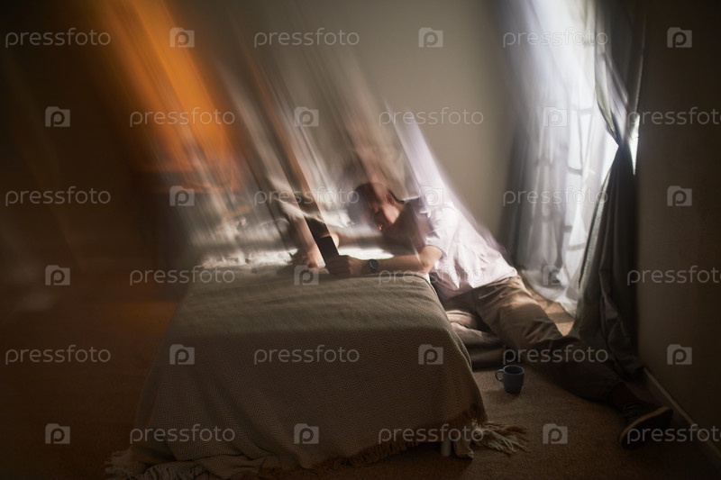 Молодой взрослый белый мужчина сидит на полу, выражая интенсивные эмоции