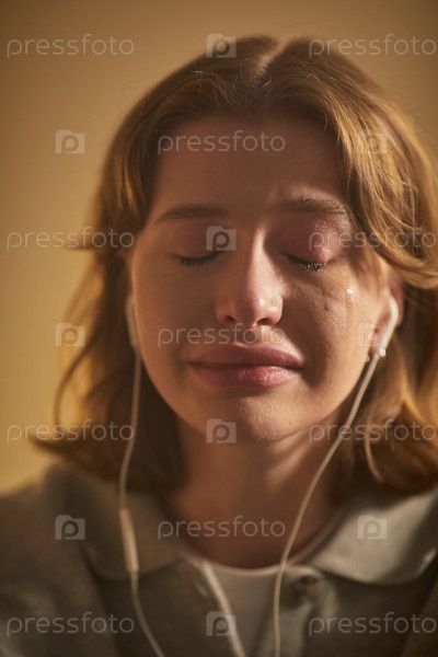 Портрет молодой взрослой белокожей женщины, плачущей во время прослушивания музыки