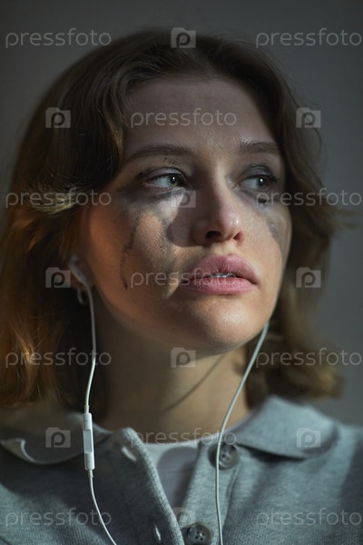 Портрет молодой женщины, плачущей с смазанной маскарой и слушающей музыку