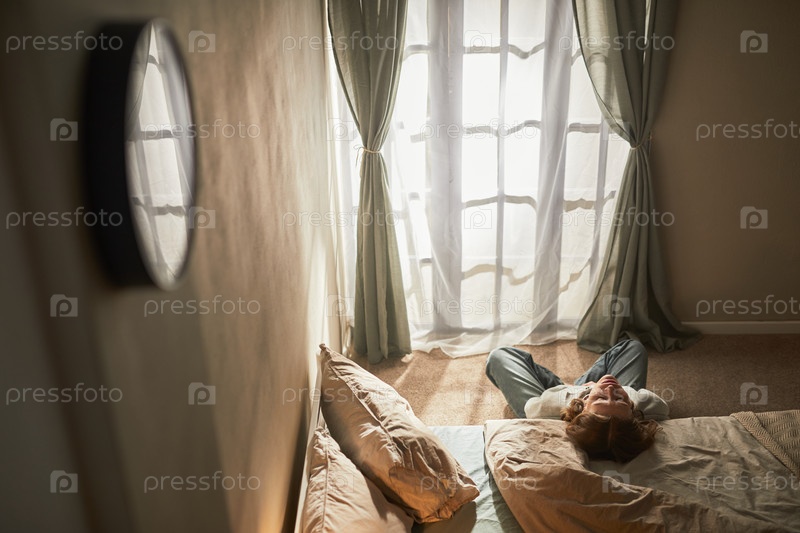 Молодая белая женщина сидит одна на полу, чувствует себя эмоционально в спальне
