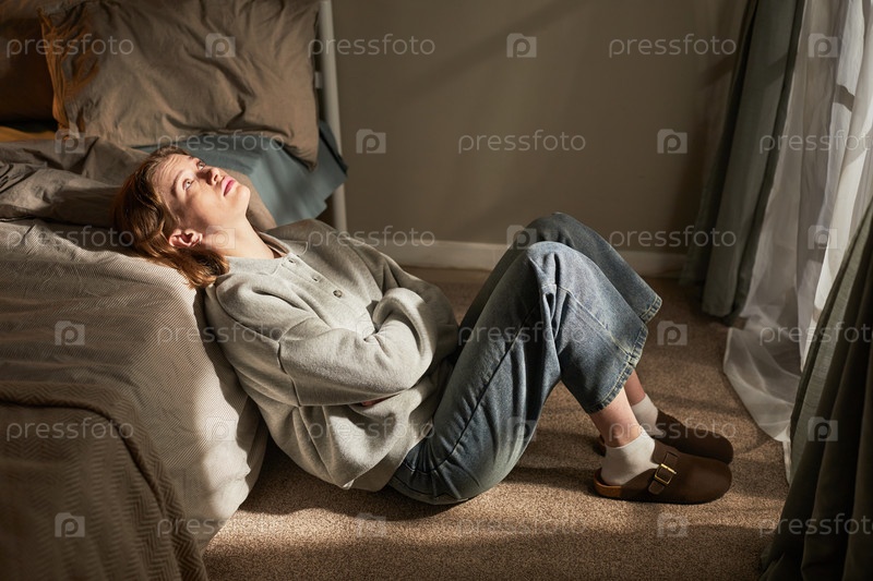 Молодая взрослая белая женщина сидит на полу, отражает возле кровати в солнечном свете