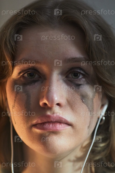 Портрет молодой белокожей женщины, плачущей с маскарой на лице