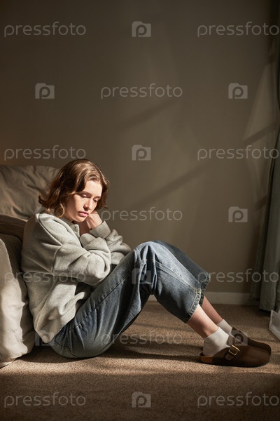 Молодая белая женщина сидит на полу, грустит и размышляет в одиночестве