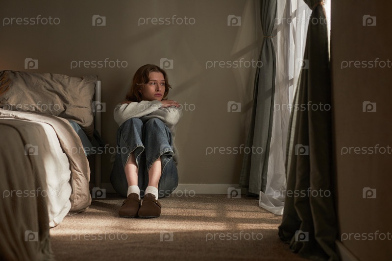Молодая белая женщина сидит одна на полу, чувствуя себя грустной и созерцательной