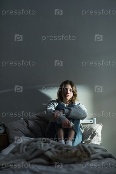 Молодая белая женщина сидит на кровати, выражая печаль и одиночество