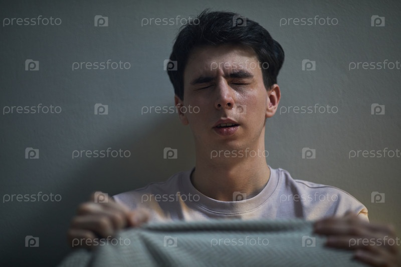 Молодой белый мужчина сидит с закрытыми глазами, выражая интенсивные эмоции