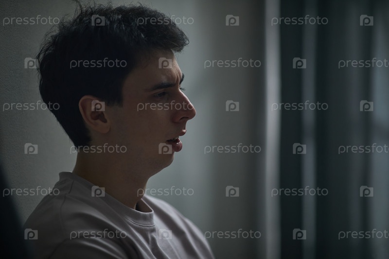 Молодой белый мужчина сидит один, выражая печаль и эмоциональное расстройство