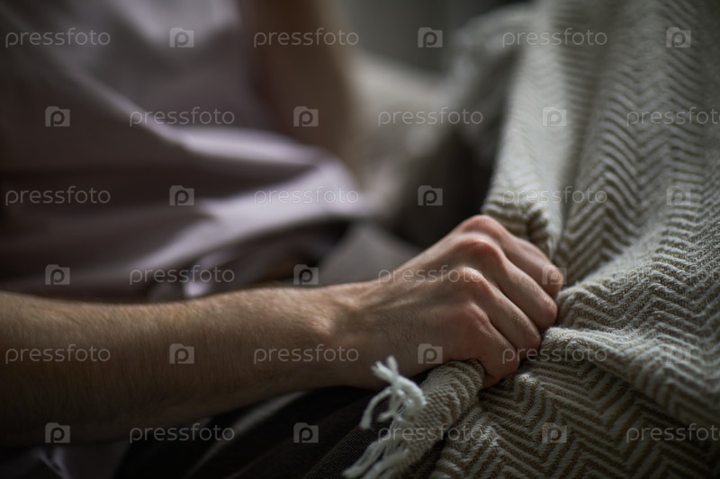 Кавказский молодой взрослый мужчина сжимает одеяло, выражая сильные эмоции