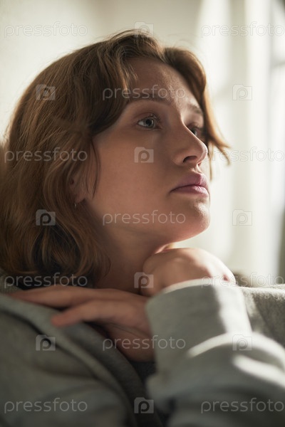 Молодая белая женщина, отражающая себя в помещении, демонстрирует заботливые эмоции