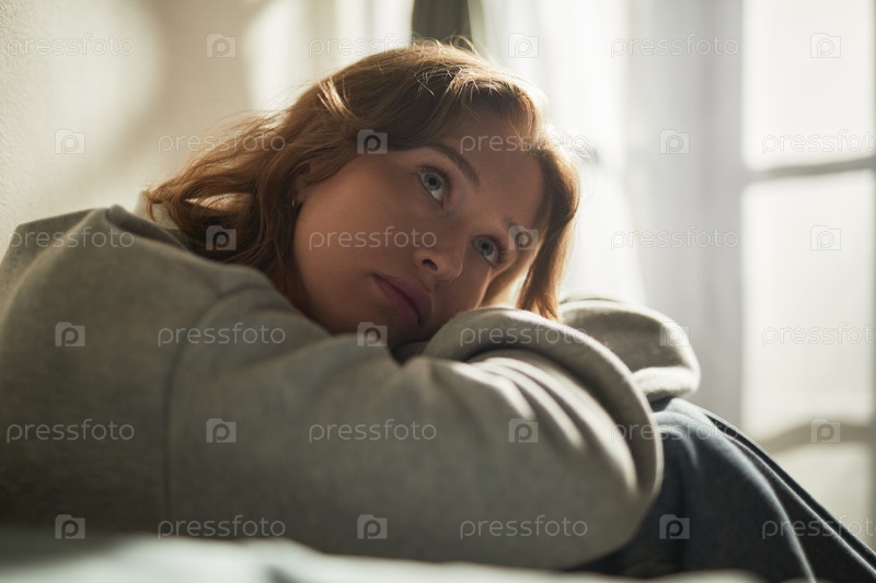 Портрет молодой взрослой белокожей женщины, сидящей в одиночестве и чувствующей меланхолию