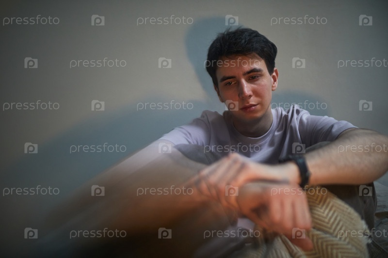 Портрет молодого белого человека, сидящего в одиночестве и выражающего грустные эмоции
