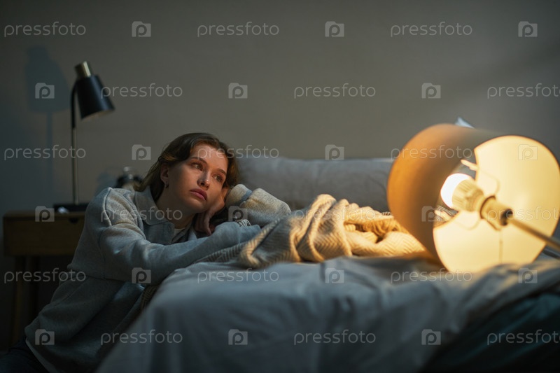 Молодая взрослая белая женщина, отдыхающая головой на кровати, выглядит глубоко мыслящей