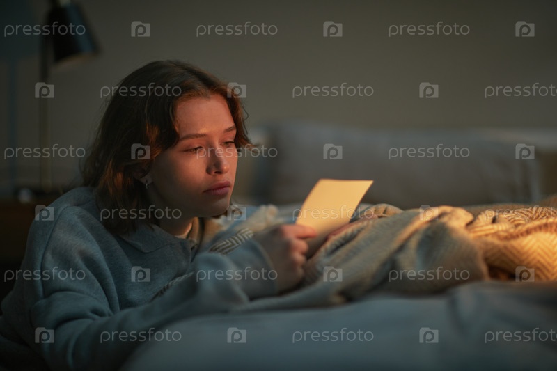 Кавказская девушка-подросток, лежащая в постели и размышляющая, глядя на старую фотографию
