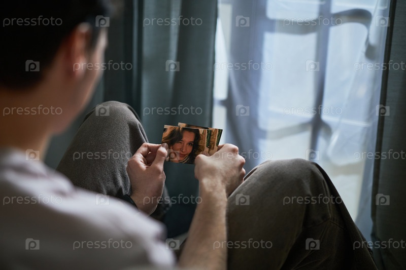 Молодой белый мужчина сидит один, держит фотографию и вспоминает любимого человека