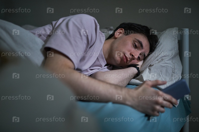 Молодой белый мужчина лежит в постели и грустит, глядя на смартфон