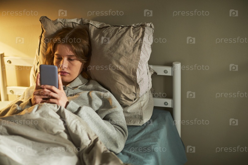 Кавказская девушка-подросток, лежащая в постели с помощью смартфона и чувствующая себя одинокой