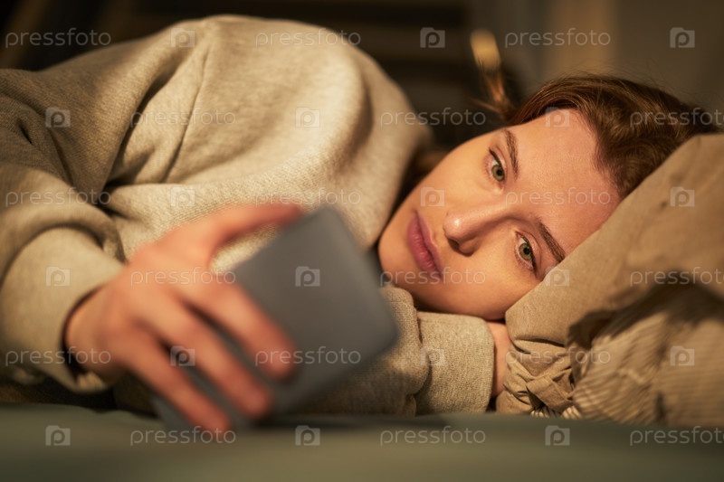Портрет молодой взрослой белокожей женщины, лежащей в постели, чувствующей себя грустной и одинокой