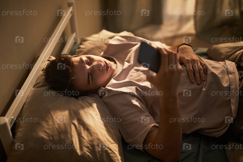 Подросток-белый мальчик, лежащий на кровати с помощью смартфона и выражающий эмоции