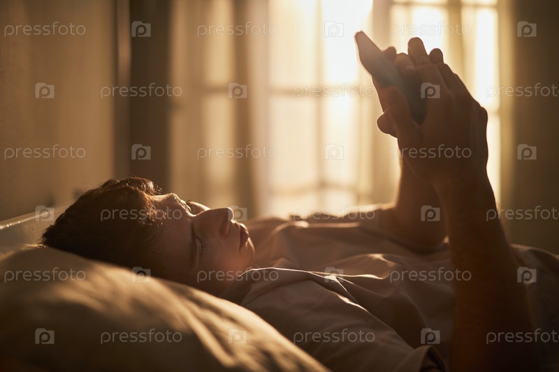Молодой белый мужчина, лежащий в постели с помощью смартфона и эмоционально размышляющий