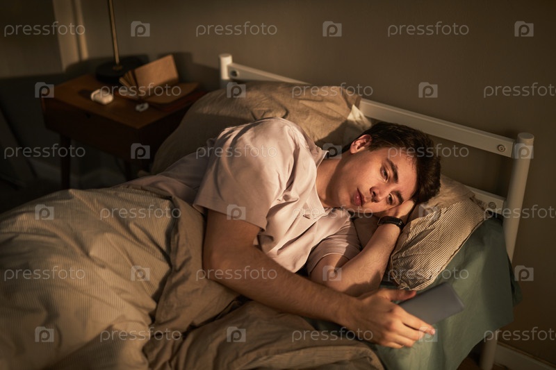 Молодой белый мужчина лежит в постели, чувствуя себя грустным, держа смартфон