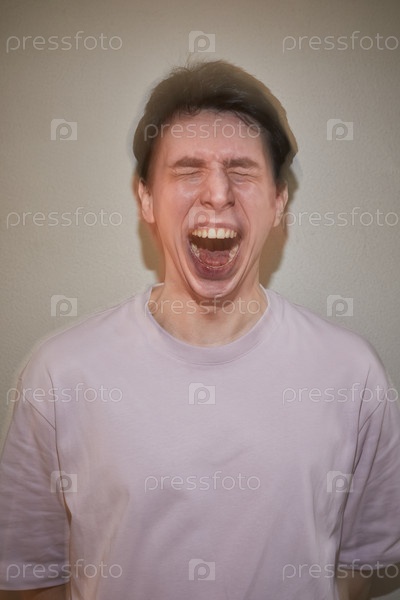 Портрет молодого белого мужчины, выражающего сильные эмоции во время крика