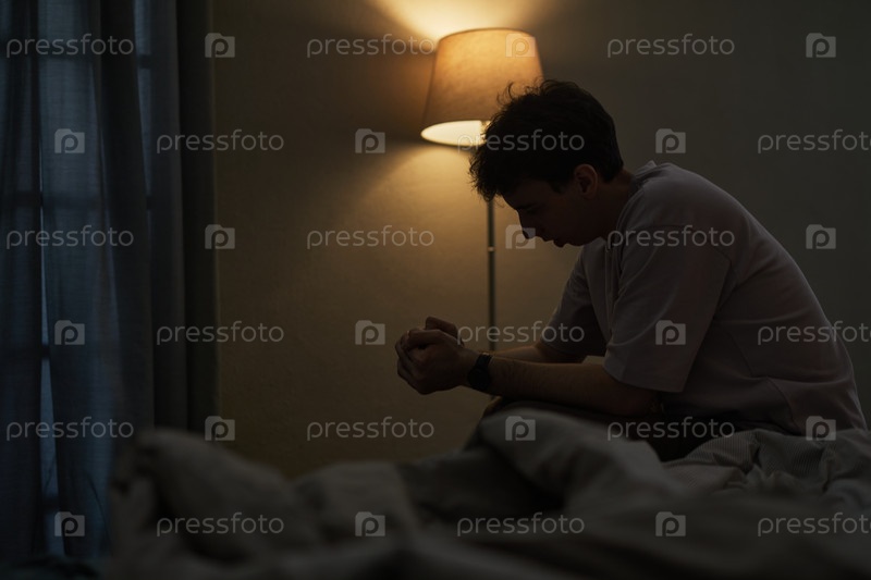 Молодой белый мужчина сидит на кровати, размышляя один в туманно освещенной комнате