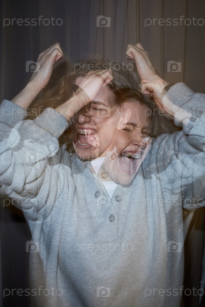 Молодая белая женщина выражает интенсивный эмоциональный дистресс в помещении