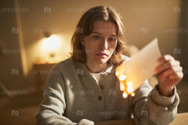 Молодая белая женщина сжигает фотографию, выражая печаль в помещении