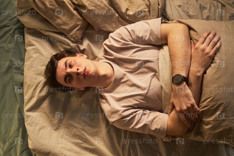 Портрет молодого белого мужчины, лежащего в постели и испытывающего апатию