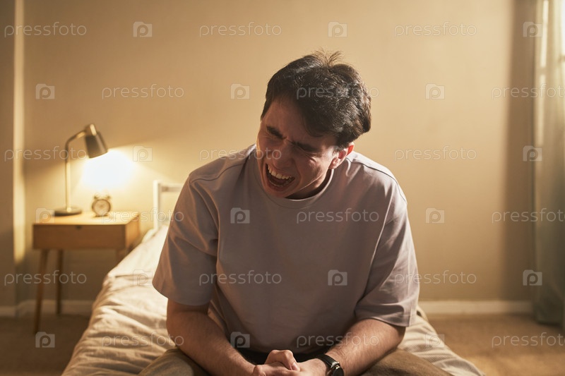 Молодой белый мужчина сидит на кровати, выражая интенсивный эмоциональный дистресс