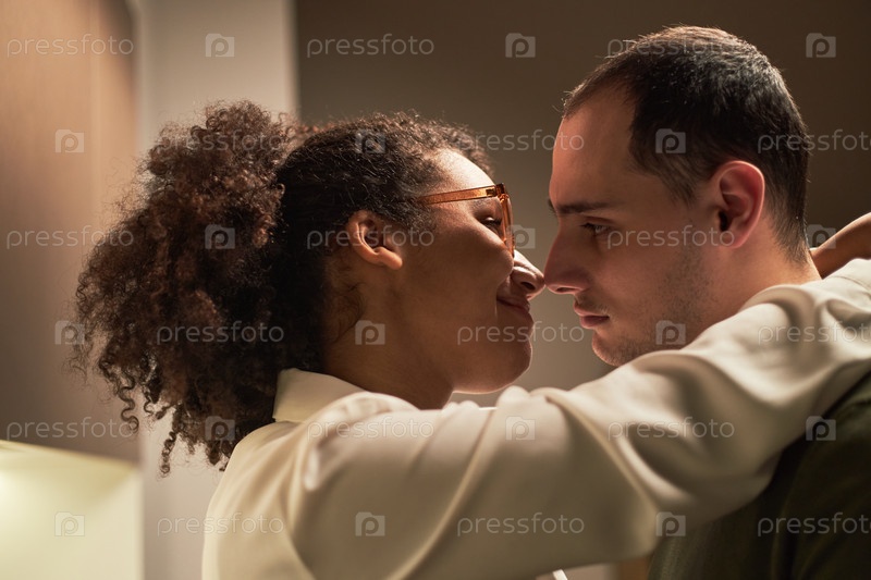 Молодая мультиэтническая взрослая пара обнимается и смотрит друг другу в глаза