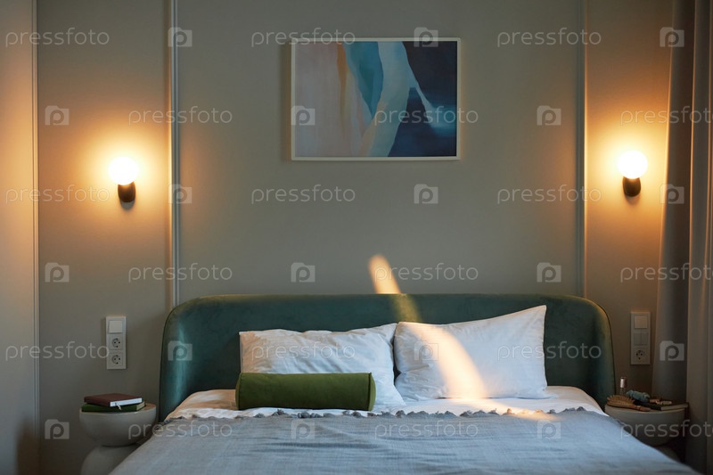 Пустой современный интерьер спальни с мягким освещением и минималистическим декором