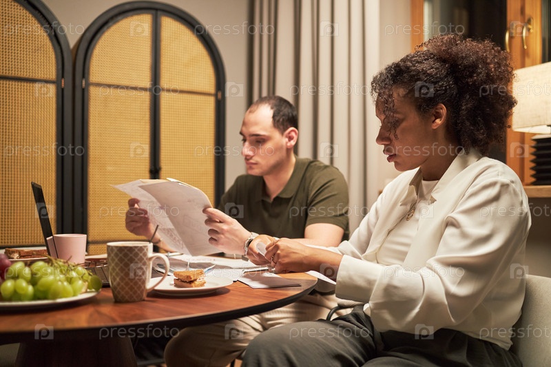 Молодой белый мужчина и молодая чернокожая женщина просматривают документы за столом