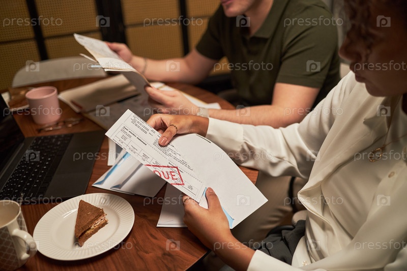 Молодой взрослый кавказский мужчина и чернокожая женщина вместе рассматривают просроченные счета за коммунальные услуги