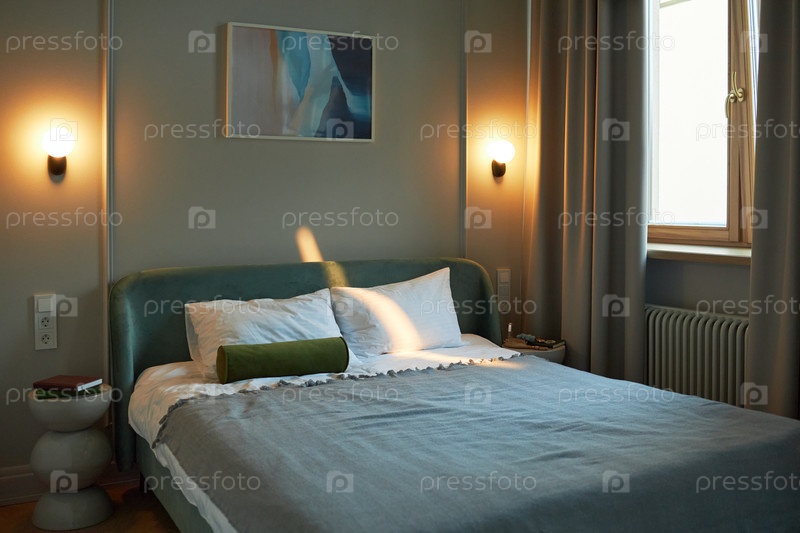 Пустой современный интерьер спальни с солнечным светом, сияющим через изготовленную кровать