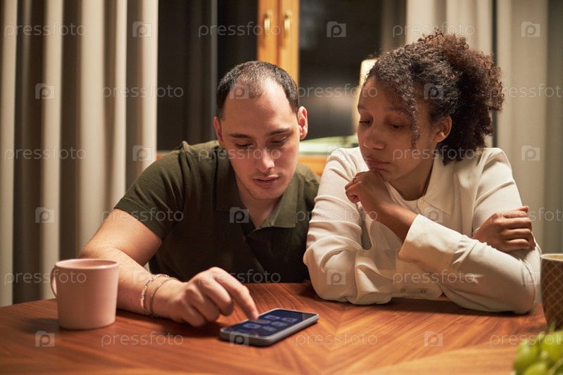 Молодой белый мужчина и молодая чернокожая женщина используют смартфон за деревянным столом