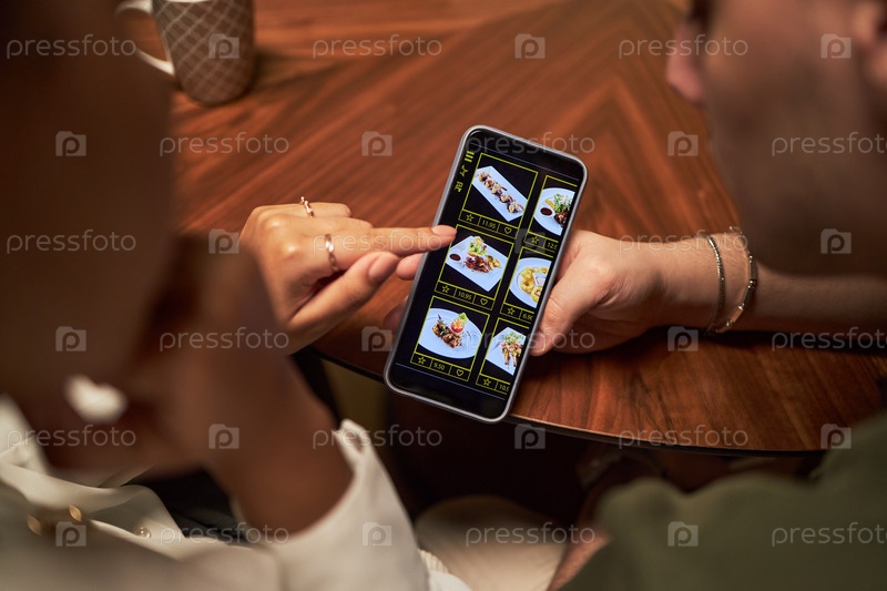 Молодая женщина и мужчина вместе просматривают меню еды на смартфоне