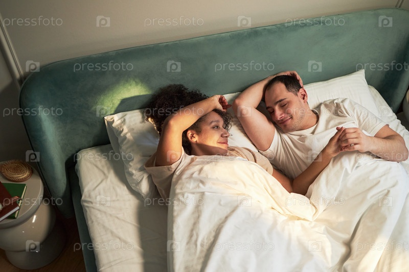 Молодая мультиэтническая пара молодых взрослых, вместе отдыхающих в постели и улыбающихся