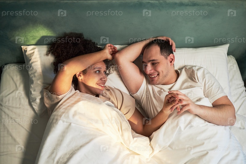Молодая взрослая мультиэтническая пара, лежащая в постели улыбаясь и держась за руки