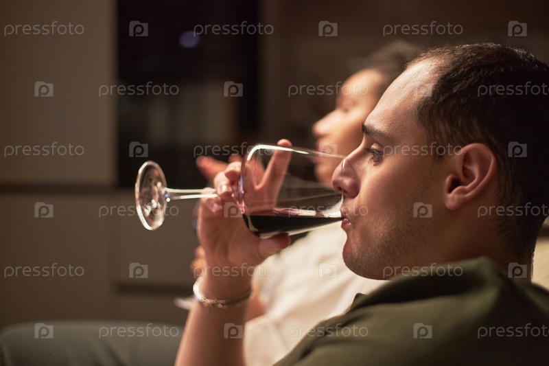 Молодой белый мужчина пьет красное вино, отдыхая в помещении с женщиной