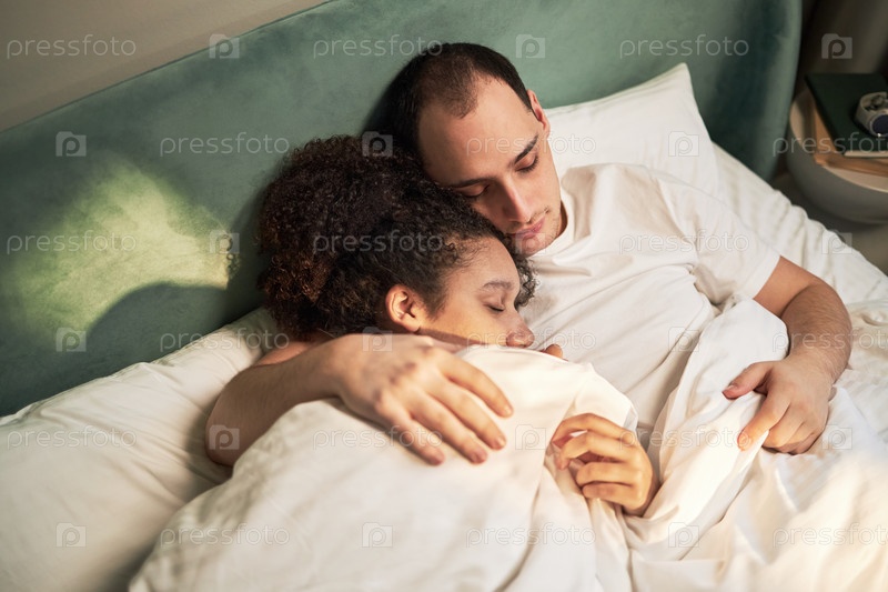 Молодой белый мужчина обнимает молодую черную женщину, отдыхая в постели