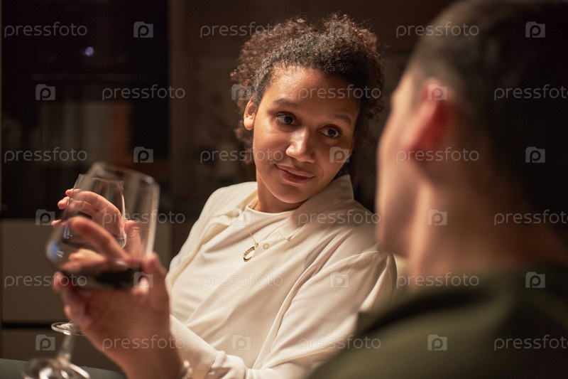 Молодая взрослая чернокожая женщина улыбается, держа винный стакан во время разговора