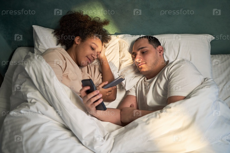 Молодая мультиэтническая пара, лежащая в постели и использующая вместе смартфоны
