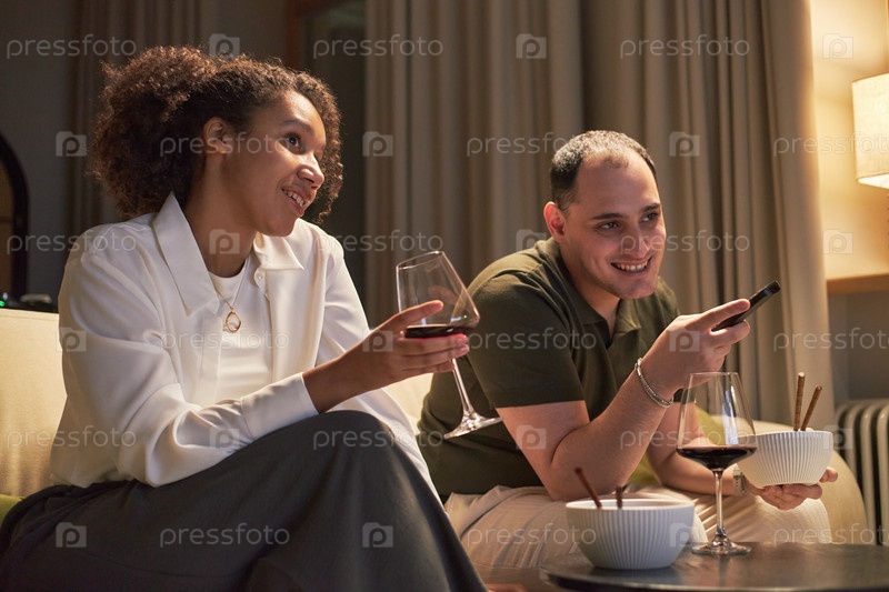 Молодая взрослая мультиэтническая пара отдыхает вместе, смотря телевизор в помещении