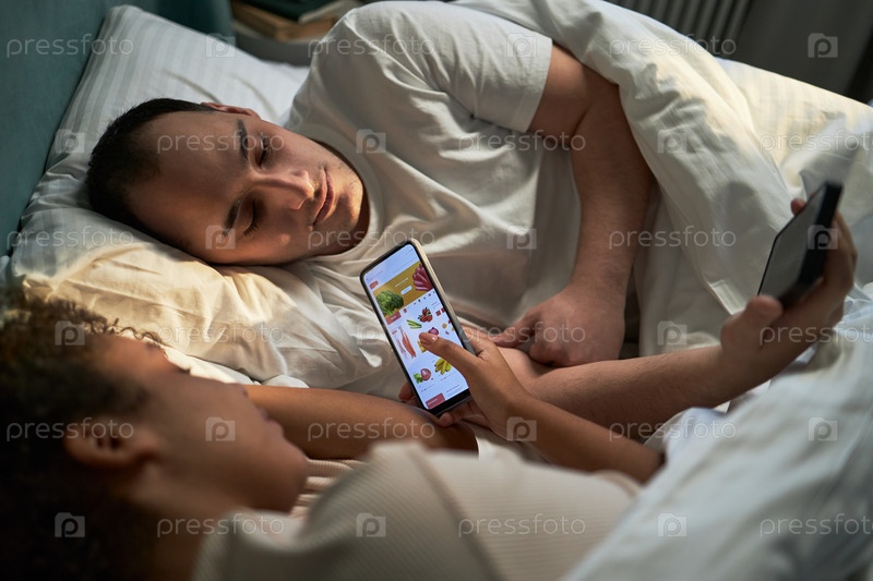 Юный кавказский мужчина и молодая черная женщина просматривают интернет-магазин в постели