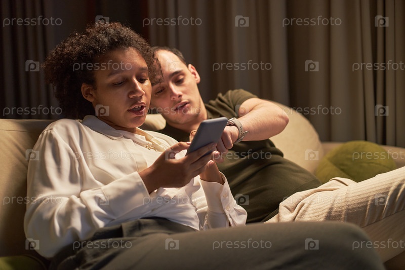 Юный кавказский мужчина и молодая чернокожая женщина используют смартфон вместе в помещении