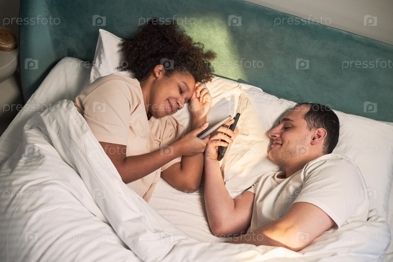 Молодая мультиэтническая пара, лежащая в постели с помощью смартфона и улыбающаяся вместе