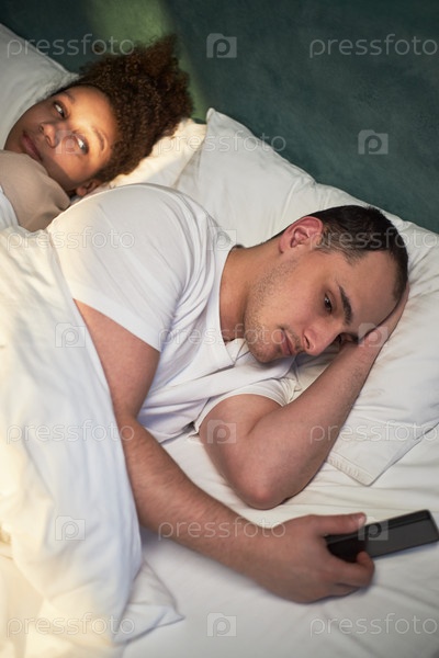 Молодой белый мужчина лежит в постели, используя смартфон рядом с молодой чернокожей женщиной