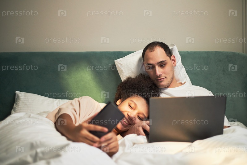 Молодая мультиэтническая пара отдыхает в постели, используя вместе смартфон и ноутбук