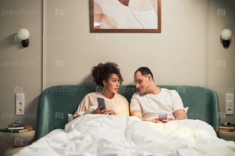 Молодая мультиэтническая пара использует смартфоны, отдыхая вместе в постели
